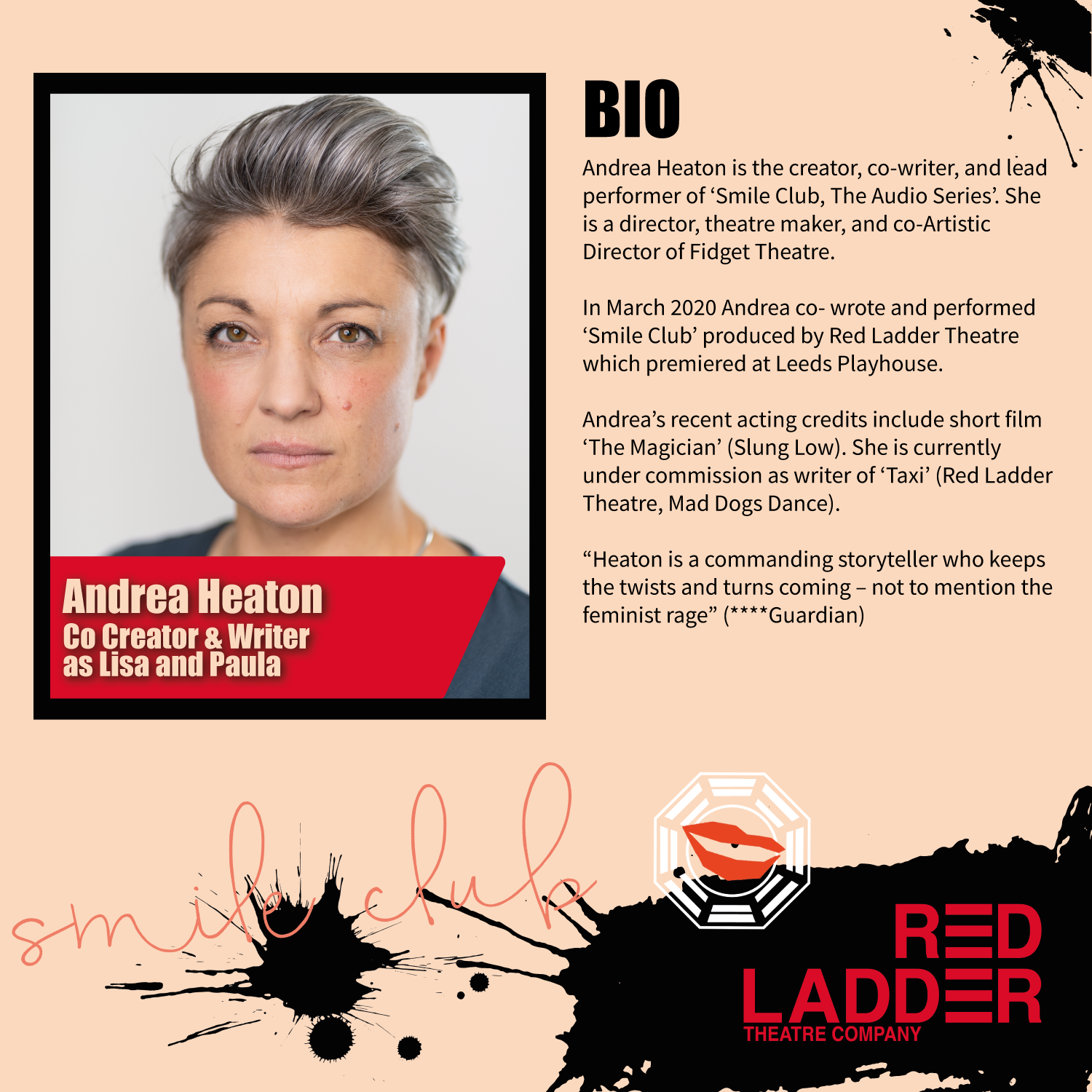 Set in a dystopian world in which a government drive exists to tame and prune unruly women deemed unable to fit into society, Smile Club is a darkly comic and searingly satirical new one woman show from writer/performer Andrea Heaton (Fidget Theatre) and writer Adam Z. Robinson (Shivers, The Book of Darkness and Light), directed by Red Ladder Theatre Company’s Rod Dixon (Mother Courage and Her Children, The Parting Glass).